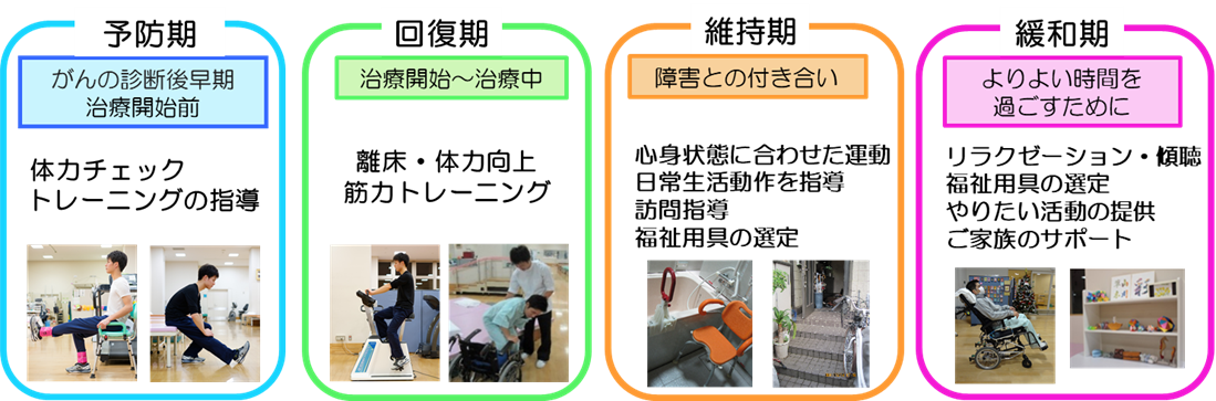 がんのリハビリテーションには、治療のどの時期においても様々な役割があります。手術や治療前やその直後からリハビリを行うことで合併症や後遺症を予防することはもちろん、運動や活動を通じて、症状を和らげることもできます。患者様一人一人にあった支援を実施していきます。