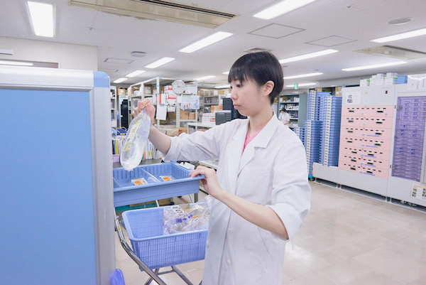 外来の患者さんのお薬は大部分が外の薬局でもらう院外処方ですので、入院されている患者さんのお薬の調剤が中心となっています。処方された飲み薬、塗り薬、注射薬の量や使い方が適切であるかをチェックし、お薬を取り揃えて患者さんにお渡ししています。処方医や病棟担当薬剤師に確認を行い、安全に医療が提供できるよう日々緊張感を持って業務を行っております。