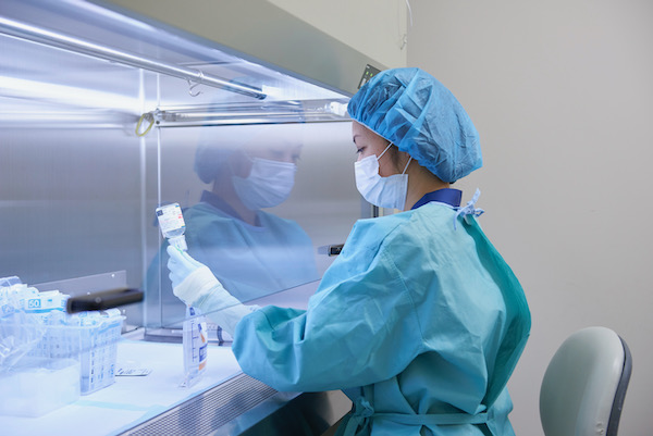 食べることができない患者さんに対して、高カロリーの注射剤を投与する場合があります。栄養豊富な注射剤は細菌が繁殖しやすいため、薬剤部のクリーンルームで調製して患者さんへ届けています。