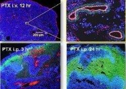 マウスに腹膜播種を作成し、抗癌剤(パクリタキセル)に目印をつけて、静脈投与と腹腔内投与の比較をしてみました。