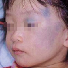典型的な太田母斑は青紫色から灰紫青色で、そこに薄い褐色の小色素斑が混在します。褐色が目立つと茶アザやソバカス、シミと誤診されることもあります。従ってシミと思っていても淡褐色斑に青色ないし灰紫色が混じっていたり、点状の色素斑が混じていたりする場合は太田母斑の可能性があります。しばしば白眼のところに青色の色素斑が存在すると出生時に顔に色素斑が存在しなくても、ほとんどの症例が思春期までに顔に青あざを生じ、拡大します。