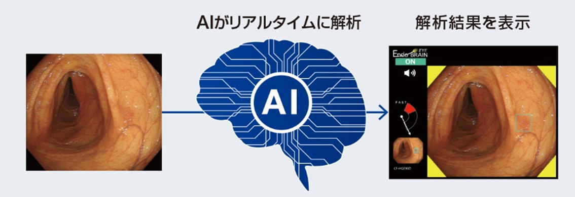 必要に応じて大腸内視鏡検査中の画像をAIが解析し、ポリープ・がんなどの病変候補を検出するとリアルタイムに音と画面上の色で警告し、検出位置が枠で表示されます。