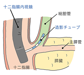 胃・大腸などの内視鏡検査とは異なり、膵臓・胆道では内視鏡的逆行性膵管胆管観察法(通称ERCP)というX線検査などを組み合わせた方法が行われます。十二指腸までスコープを進め、その先は内視鏡の先端から造影カテーテルという細いチューブを胆管や膵管に挿入して、造影剤を直接注入し、レントゲン写真を撮影することで、胆嚢や胆管及び膵管の異常を詳しく調べる検査です。同時に胆道膵癌の病変細胞診断や胆道閉塞のステント治療、胆管結石・膵石の治療にも応用されています。また、当院では、胃・胆道・膵臓切除手術後で、通常ERCPスコープでは乳頭に到達できない症例に対しては、小腸バルーン内視鏡を使ってERCPを行っております。