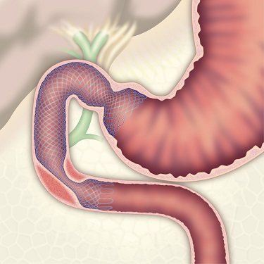 胆道・膵臓は、十二指腸に近接しているため、癌が増大するとしばしば十二指腸・大腸が閉塞します。消化管が閉塞すると食事が通らなくなり嘔吐などの症状が出現します。従来のバイパス手術に代わり、閉塞部に内視鏡を用いて金属製のステント留置を行われるようになってきました。