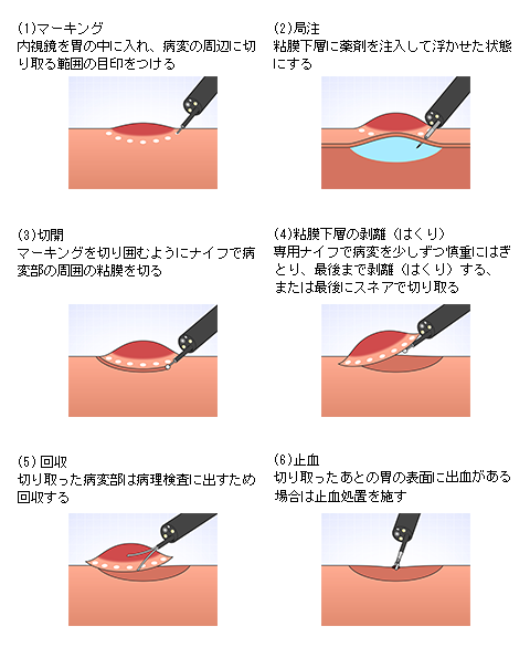 内視鏡を使った治療法には、スネアと呼ばれる金属の輪を病変部に引っ掛け、高周波電流を流して切り取る方法(内視鏡的粘膜切除術;Endoscopic mucosal resection:EMR)や、専用の処置具を使ってより大きな病変を剥がす内視鏡的粘膜下層剥離術(Endoscopic submucosal dissection: ESD)などがあります。