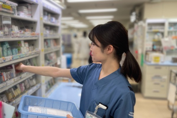 外来の患者さんのお薬は大部分が外の薬局でもらう院外処方ですので、入院されている患者さんのお薬の調剤が中心となっています。処方された飲み薬、塗り薬、注射薬の量や使い方が適切であるかをチェックし、お薬を取り揃えて患者さんにお渡ししています。処方医や病棟担当薬剤師に確認を行い、安全に医療が提供できるよう日々緊張感を持って業務を行っております。