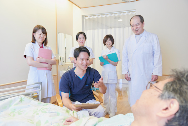 がんや心不全の患者さんの身体的・精神的・社会的(金銭・就労に関わる)苦痛などを和らげるため、医師・看護師・心理士・栄養士・理学療法士・MSW(医療ソーシャルワーカー)がチームをつくり活動しています。週1回ミーティングと回診を行ったり、個別に相談に応じたりしています。