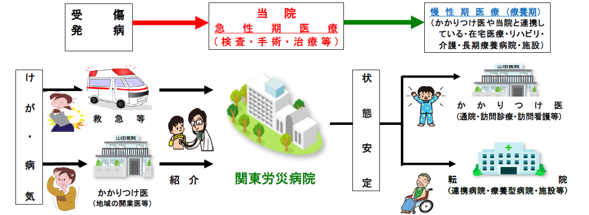 このため、入院時より退院に向けた支援を行い、急性期の集中治療に目途のついた患者さんにつきましては、早期の退院 (通院治療・かかりつけ医等へのご紹介)や転院 (当院と連携する病院・施設入所等) をお願いし、新たに急性期の治療が必要な患者さんに入院ベッドを提供するという方針をとっています。