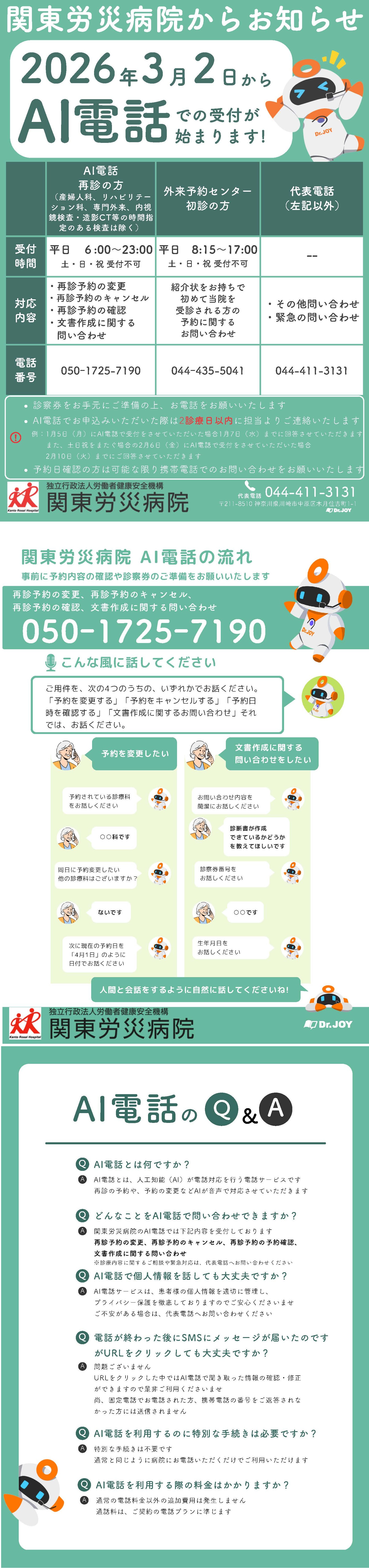 今般、当院への電話の繋がりにくさ解消を目的として、令和8年3月2日(月)より再診の方の予約変更、キャンセル、日にち確認、文書に関するお問い合わせに限りAI電話の運用を開始することといたしました。ただし、リハビリテーション科、精神科、放射線診断科、放射線治療科のみ令和8年3月16日(月)から運用開始となります。
