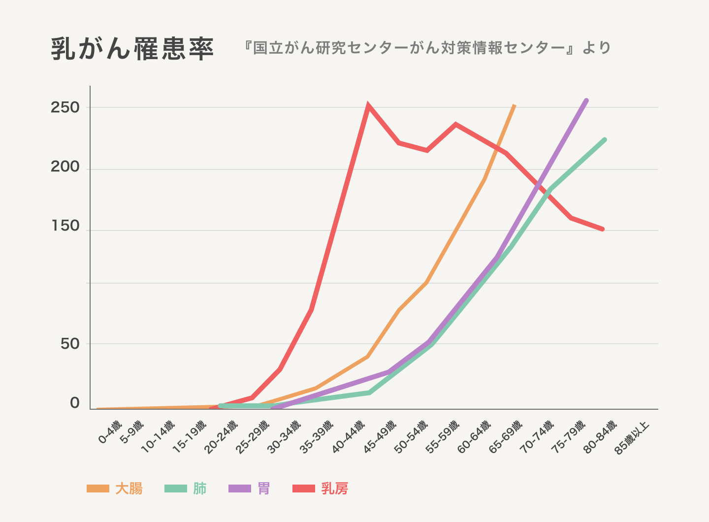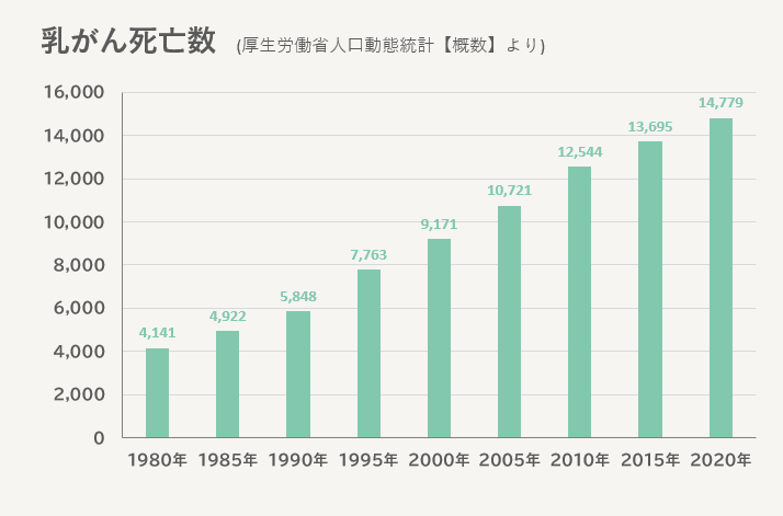 乳がんは、30代や40代をピークに年々増加しているため、早期発見・治療のためにも早目の受診をお勧めします。